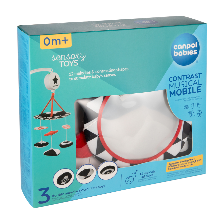 Kontrastní plyšový kolotoč s melodiemi SENSORY je určen k připevnění nad postýlku těm nejmenším dětem. Na kolotoči lze pouštět až 12 melodií, které skvěle poslouží při usínání. Součástí je velké zrcadlo a odnímatelné prvky. Senzorické barvy stimulují rozvoj smyslů dítěte.