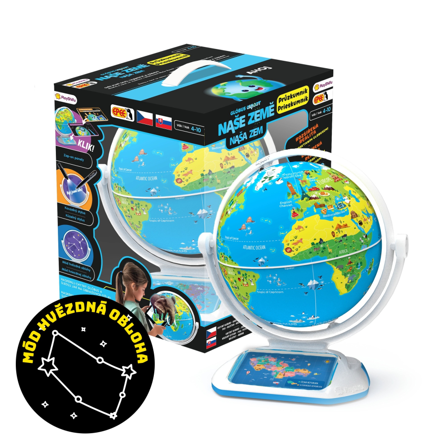 Interaktivní Glóbus Naše Země – Průzkumník, se kterým se dozvíte mnoho nových věcí a užijete spoustu zábavy. Prozkoumejte více než 400 zajímavostí a více než 1000 faktů napříč 6ti kategoriemi – kultura, kuchyně, památky, vynálezy, zvířata a mapy. Pomocí vašeho zařízení a prostřednictvím stažené aplikace můžete prozkoumat svět. V balení naleznete Glóbus, krátký návod, cestovní pas, knížku s nálepkami, vyměnitelné panely, USB nabíjecí kabel a razítko. Hračka obsahuje nevyměnitelnou dobíjecí Li-ion baterii. Doporučený věk od 4 let.