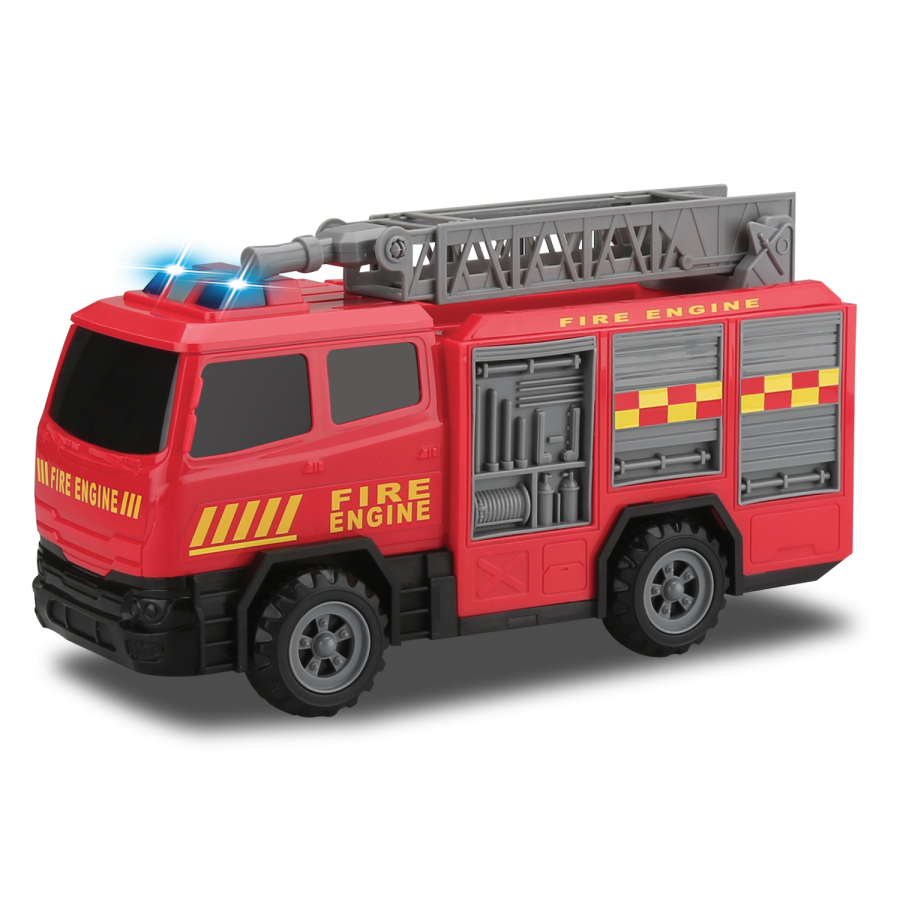 Hasičské auto na setrvačník, se zvukovým a světelným efektem a pohyblivými částmi. Auto vyžaduje 2AA baterie, nejsou součástí balení. Pro děti od 3 let.