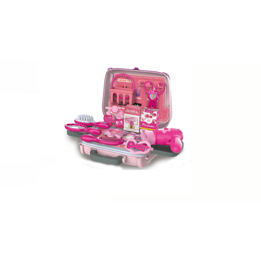 Součástí sady jsou hřebínky, zrcátka, voňavky, fén, nůžky. Všechny doplňky jsou uschované v praktickém kufříku.