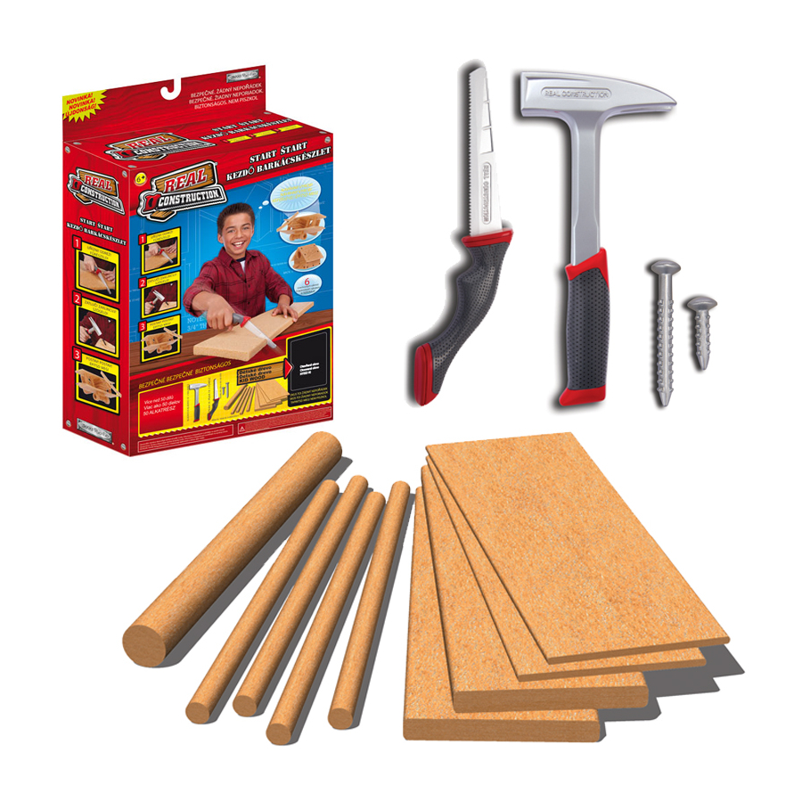 Sada Real construction Start pro malé kutily. Součástí je pilka, kladívko, šroubovák, prkénka, hranoly, kulatiny a další. Části jsou vyrobeny z plastového materiálu KID WOOD.